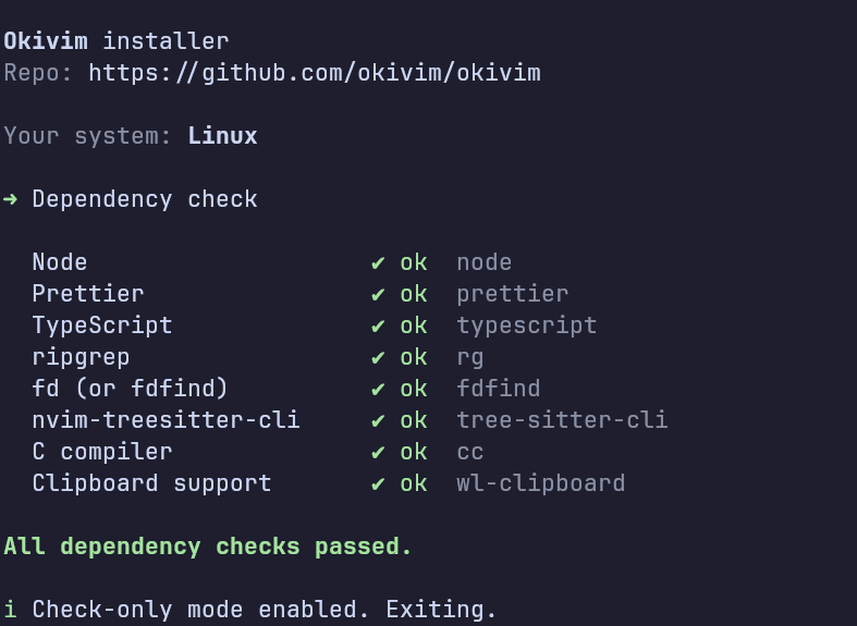 The installer does not install dependencies; it only creates a backup of your current configuration and installs the Okivim configuration.